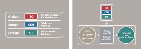 Internationella standarder utvecklas och revideras i CEN och ISO:s kommittéer. De nationella standardiseringsorganen, i Sveriges fall SIS, påverkar arbetet genom att skicka svenska representanter som deltar i det internationella arbetet. I Sverige samlar SIS svenska intressenter i så kallade spegelkommittéer som bevakar (speglar) det internationella arbetet. Genom att delta i SIS nationella spegelkommittéer kan svenska organisationer bevaka och påverka både nya standarder och vara med och revidera befintliga standarder. Representanter från svenska organisationer kan också, genom SIS, ingå i de arbetsgrupper som skriver europeisk och global standard.