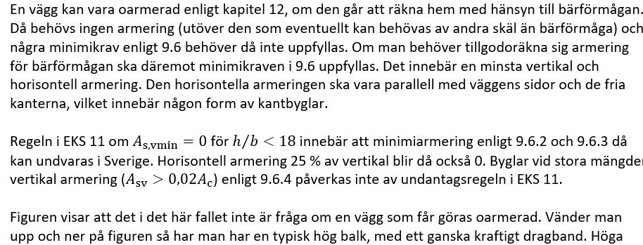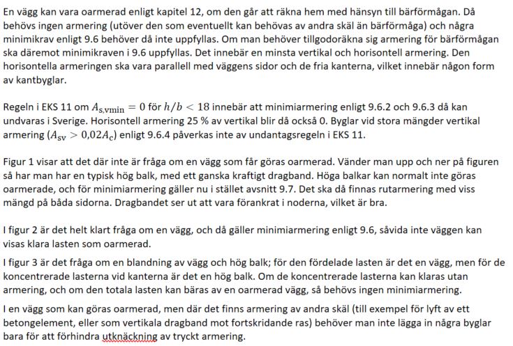 Ett konkret exempel: En vägg med en fönsteröppning som är 1210 mm bred och med ett 3200 mm högt överstycke över fönstret. Det är beskedliga laster på väggens överkant? Det känns inte motiverat med minarmering både vertikalt och horisontellt. Går det att på något sätt verifiera/bevisa att det inte är nödvändigt med minarmering? Om det trots allt måste in minarmering; räcker det om vertikala stänger förankras förbi den övre trycksträvan eller måste vertikala armeringen gå hela vägen upp till väggens överkant?