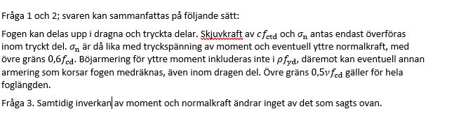 Fråga: Min fråga gäller tvärkraftsbrottmoden hävstångsbrott i betong, kapitel 7.2.2.4. För brottmoderna betongkonsbrott (7.21.4) och betongkantbrott (7.2.2.5) ges möjlighet att höja bärförmågan genom att lägga in kompletterande armering. Kontroll av betongen utgår då och ersätts av kontroller av den kompletterande armeringen. Ingen sådan möjlighet att armera mot brottmoden verkar finnas för hävstångsbrott i betong. Bärförmågan reduceras i stället vid förekomst av armering. Dels genom faktorn 0,75 i ekvation 7.39b vid förekomst av kompletterande armering och dels möjligen vid förekomst av ytarmering genom faktorn Ψre,N i beräkningen av NRk,c. Är detta rätt uppfattat? Och är det i så fall inte märkligt att bärförmågan med hänsyn till hävstångsbrott i betong beror av bärförmågan med hänsyn till betongkonsbrott, men att armering som i praktiken höjer bärförmågan med hänsyn till betongkonsbrott sänker bärförmågan med hänsyn till hävstångsbrott i betong? Är det möjligt att NRk,c.i ekv. 7.39b egentligen skulle ersättas med en bärförmåga relaterad till den kompletterande armeringen? Borde inte armering rätvinkligt mot ytan höja bärförmågan? Den höjer ju i praktiken bärförmågan med hänsyn till betongkonsbrott, och bärförmågan med hänsyn till hävstångsbrott i betong är ju beroende av denna.