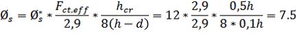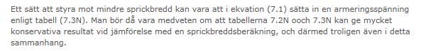 Om det finns krav på sprickbreddsbegränsning bör tillsvidare minimiarmeringsvillkoret (7.1) tillämpas med en begränsad spänning enligt tabell 7.2N. I så fall är det viktigt att justera stångdiametern enligt ekv (7.7N). I ekv (7.7N) ska för övrigt ingå en faktor k1 = 0,8 i täljaren. För att få fram aktuell spänning ska omräkningen tillämpas "baklänges", dvs man går in i tabellen med ett omräknat f*.